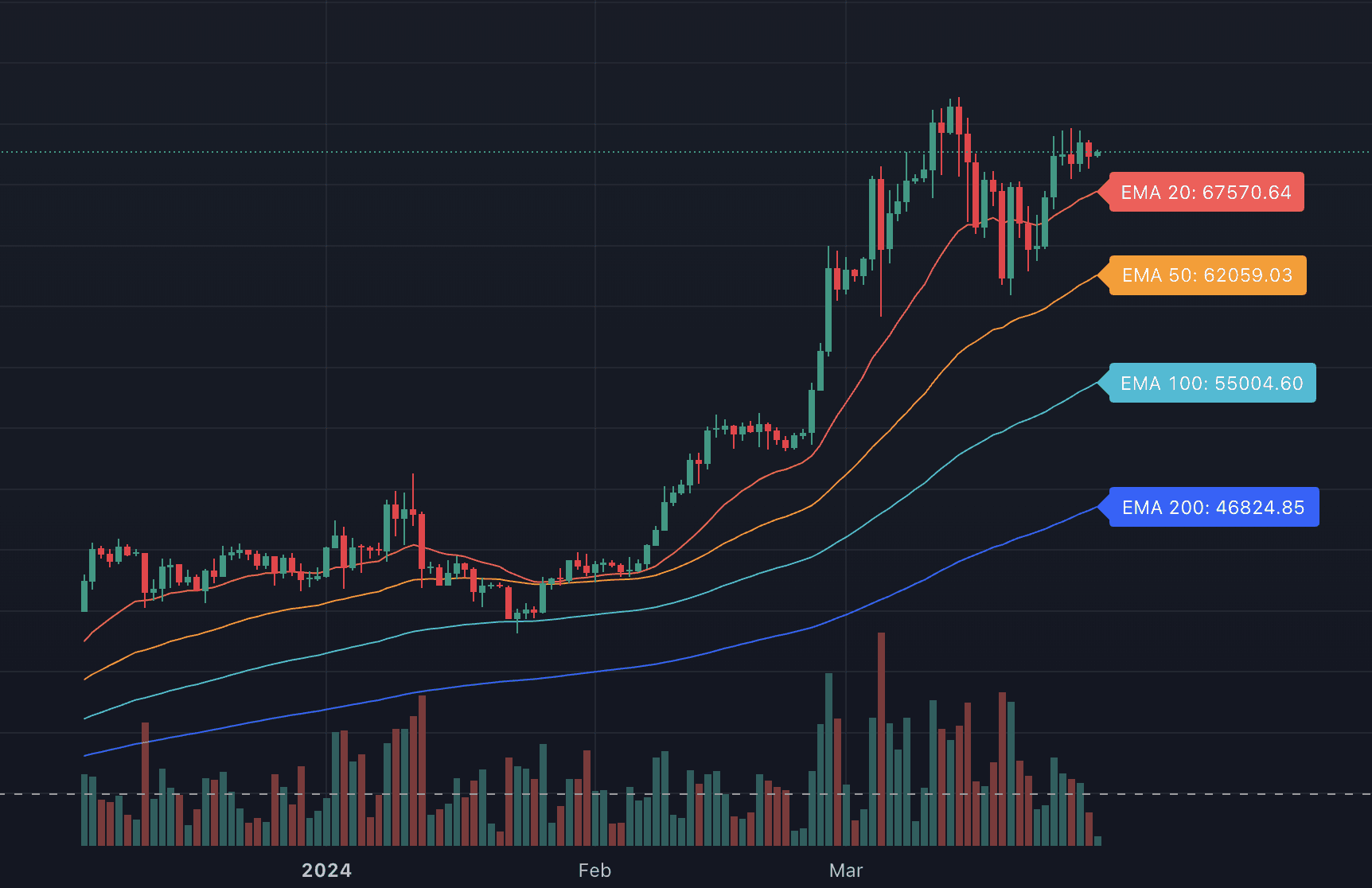 Trend Confirmation: When a shorter-term Exponential Moving Average (EMA) line crosses above or below a longer-term EMA line on a chart, generating a trading signal indicating a potential trend change.